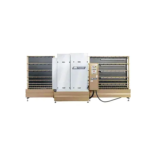 The CRL 63" Open Top Vertical Glass Washer can wash glass to 63" (1.60 m) wide in one pass, and up to 126" (3.20 m) wide in two passes. The machine will operate from 3.28' to 22.9' per minute (1.0 x 7 mpm), and has a load capacity of 300 lbs. (136 kg). You can wash glass from single strength to 1/2" (12 mm) thick, and from a minimum size of 4" x 10" (102 x 305 mm). Frame components in contact with the washing areas are made of stainless steel. Power conveyors, blower sound enclosure, recirculated heated detergent, recirculated miser rinse, and a fresh water electric solenoid valve are standard. Also included are glass inspection lights on the exit conveyor. The four brushes are Low-e compatible. Set-up and maintenance is easy, and can be completed without a factory service technician.