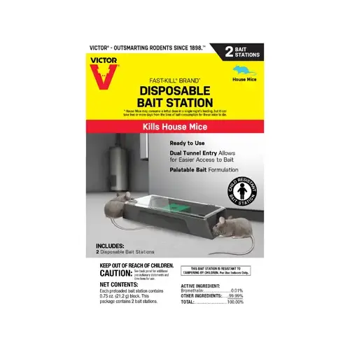 Do you have pesky mice scurrying throughout your home? Victor Fast-Kill brand disposable mouse bait station has got you covered! The bait station arrives pre-filled with a single-feed non-anticoagulant rodenticide, so that it's ready to use upon opening the package. To use, simply place the bait station in areas of high rodent activity. When the bait is depleted, simply throw away the entire station.