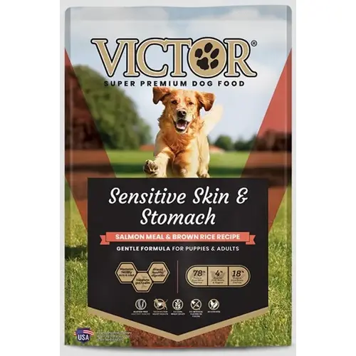 Sensitive Skin and Stomach Salmon Meal & Brown Rice Recipe is ideal for dogs with sensitivities or allergies. This digestible formula is gentle on the stomach and formulated without common allergens like gluten, chicken, corn, or soy. With omega 3 and 6, plus Vitamin E, this recipe supports a healthy coat and skin. Like all VICTOR products, the majority of the protein in this recipe comes from high-quality meat sources. Specifically, 78% of the protein comes from salmon and fish meals. The protein to fat ratio for this formula is: 26% protein and 14% fat. VICTOR Sensitive Skin and Stomach Salmon Meal & Brown Rice Recipe for Dogs is formulated to meet the nutritional levels established by the AAFCO Dog Food Nutrient Profiles for All Life Stages, except for growth of large size dogs (70 lb. or more as an adult). Guaranteed Analysis: Crude Protein ... 26.0% min. Crude Fat ... 14.0% min. Crude Fiber ... 4.0% max Moisture ... 10.0% max Zinc ... 150 mg/kg min Selenium ... 0.40 mg/kg min Biotin ... 0.10 mg/kg min Vitamin E ... 150 IU/kg min Taurine ... 0.1% min Omega-6 Fatty Acids ... 2.8% min Omega-3 Fatty Acids ... 1.5% min Total Microorganisms (Bacillus coagulans, Bacillus subtilis) ... 80,000,000 CFU/lb Ingredients: Salmon Meal, Brown Rice, Grain Sorghum, Whole Grain Millet, Fish Meal, Pork Fat (preserved with mixed Tocopherols), Dehydrated Alfalfa Meal, Yeast Culture, Natural Flavor, Potassium Chloride, Carrot Powder, Tomato Pomace, Salt, Organic Dried Seaweed Meal, Taurine, Choline Chloride, Calcium Stearate, Zinc Methionine Complex, Vitamin E Supplement, DL-Methionine, Iron Amino Acid Complex, Hydrolyzed Yeast, Manganese Amino Acid Complex, Silicon Dioxide, L-Carnitine, Selenium Yeast, Brewers Dried Yeast, Copper Sulfate, Niacin Supplement, Vitamin B12 Supplement, Vitamin A Supplement, D-Calcium Pantothenate, Mono and Diglycerides of Fatty Acids, Thiamine Mononitrate, Biotin, Yucca Schidigera Extract, Calcium Carbonate, Riboflavin Supplement, Calcium Iodate, Pyridoxine Hydrochloride, Vitamin D3 Supplement, Tetrasodium Pyrophosphate, Rosemary Extract, Green Tea Extract, Spearmint Extract, Inulin, Lecithin, Folic Acid, Dried Bacillus Coagulans Fermentation Product, Dried Bacillus Subtilis Fermentation Product Contains a source of live (viable), naturally occurring microorganisms