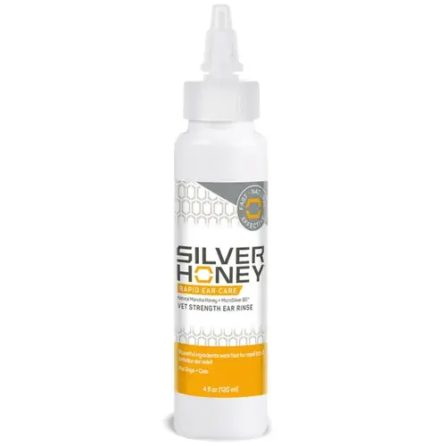 NEW Silver Honey Rapid Ear Care is a line of revolutionary pet ear cleaning and care solutions for all types of ear care needs. Silver Honey Vet Strength Ear Rinse is a great cleansing solution for ongoing ear health, to keep ears free of debris, and help dogs with swimmer?s ear. 4 fl. oz. Bottle. Can be used in conjunction with Rapid Ear Care Vet Strength Pet Wipes. What does this treat? Silver Honey Vet Strength Ear Rinse is an effective cleaning solution for ongoing ear health to keep ears free of debris and help prevent infection. After adding to the ear and massaging in, allow the pet to shake their head. The rinse will help remove dirt, debris, and wax buildup to clear the ear for more comfort, and soothe irritation. Antibiotic-free and no-sting, the rinse is for both dogs and cats. Ingredients: Active Ingredient: Silver (MicroSilver BG) 0.1% Inactive Ingredients: Water, Acrylates Copolymer, Glycerin (USP), Propylene Glycol (USP), Polyglyceryl-4 Caprate, Panthenol, Benzyl Alcohol, Ethylhexylglycerin, MEL (Manuka Honey), Citrus Limon Peel Oil, Sodium Hydroxide, Citric Acid.