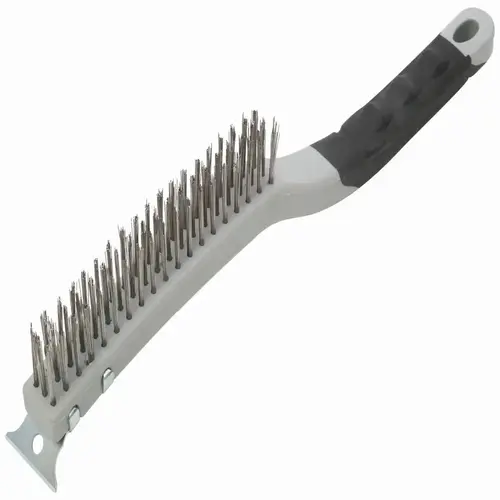Warner Soft Grip Stainless Wire Brush With Scraper. Removes Rust, Scale, And Flaking Paint. For Roughing Smooth Surfaces Before Adding Adhesives. Polypropylene And Thermoplastic Rubber Handle. Stainless Steel Wire Bristles. Mfg #10483