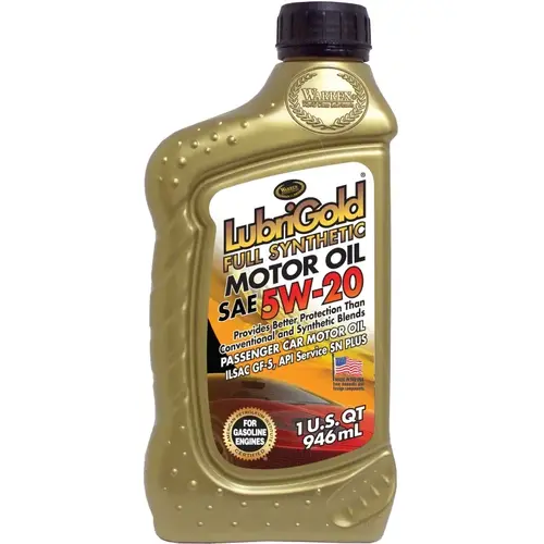 LubriGold full synthetic SAE 5W-20 dexos1 motor oil is top tier, high detergent automotive engine oil specially formulated to meet the stringent lubrication requirements of today and tomorrow's engines. It meets API SN which is required for 2012 and later engines. Synthetic base oils combine with carefully selected additive packages to provide maximum protection against wear, rust, corrosion, oxidative thickening, acid formation, sludge and varnish.