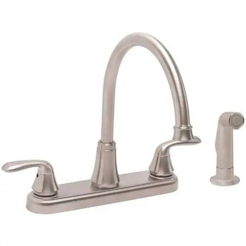 This kitchen faucet has twin lever handle. It has a hybrid construction with lead-free polymer waterways. Its ceramic disc cartridge provides for trouble-free performance. It is suitable for 8 in. on-center, 3-hole installations. Includes 18 in. stainless steel braided supply lines with 3/8 in. compression connectors.
