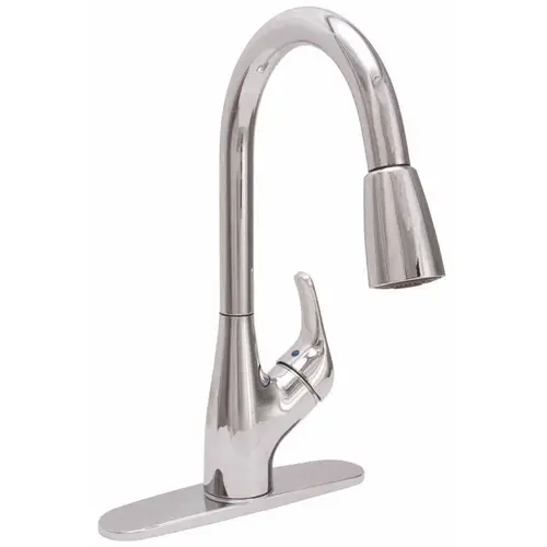 Kitchen faucet with pull-down single lever handle. Hybrid construction with lead-free polymer waterways. Includes ceramic disc cartridge for trouble-free performance. 20 in. stainless steel braided supply lines with 3/8 compression connectors.
