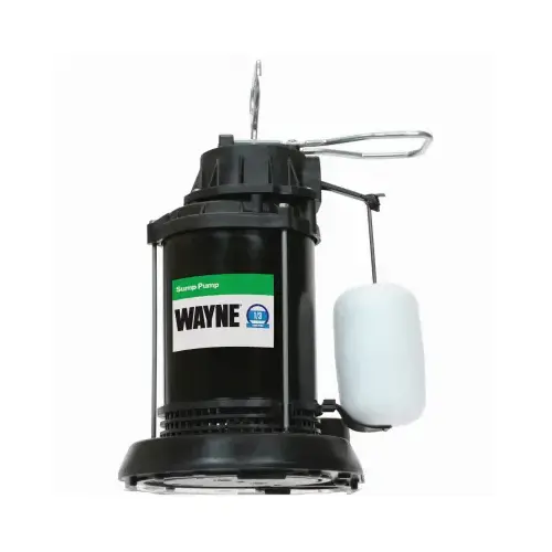 1/3 hp coated steel and reinforced thermoplastic submersible sump pump. Assembled in the US with foreign and domestic parts. Float switch tested to 1 million cycles. Top suction design eliminates air locks and clogging from debris in bottom of sump pit. Epoxy-coated steel motor housing and corrosion-resistant, thermoplastic pump base. Fully submersible. 1/3 hp max flow rate is 3600 gph at 0 ft. 1 1/2 NPT discharge. For use in 11 in Dia or larger sump basins.