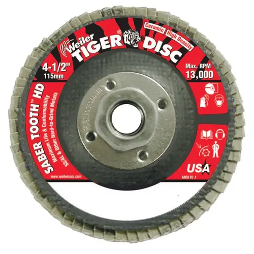 Weiler 50134 Tiger Saber Tooth Ceramic High Density Abrasive, 4-1/2 in dia, 60 Grit, 5/8 in-11 UNC Nut, 13,000 RPM, Type 27 Red
