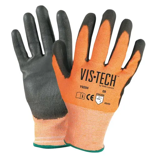 Hi-Vis Cut Resistant Shell Provides A High Level Of Protection & Creates Awareness In Tough Environments. Polyurethane Palm Coating Provides Excellent Grip And Tactility. Outstanding Fit, Comfort And Flexibility. 13 Gauge. ANSI Abrasion Level 5. ANSI Punc