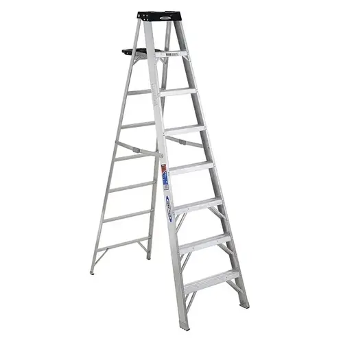 The 378 Aluminum 8 foot Step Ladder has a duty rating of 300 pounds yet is lightweight and easy to transport. The Tool-Tra-Top has a drill holster, convenient tray for tools/paint and small parts. There is also a sturdy molded paint can hanger on the backside of the top. The Spill-Proof pail shelf has a rag rack and holds a gallon paint can and automatically closes with the ladder. There is a full set of horizontals on the rear section and the 4 foot, 5 foot, and 6 foot models have a unique H spreader with hand grip for easy one-handed carrying and closing. The Traction-Tred steps are slip resistant and double riveted.
