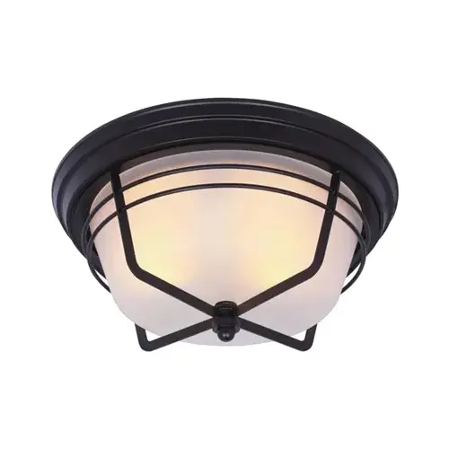 Provide welcoming light outside your home with the Bonneville two-light flush-mount fixture. With bold lines and a weathered bronze finish, the fixture features a traditional appearance. Parallel lines rimming the top of the fixture add distinction. This fixture is ideal for installation in front or back entryways and mounts flush against the wall to blend with your home. A frosted glass bowl provides broad, diffuse illumination.