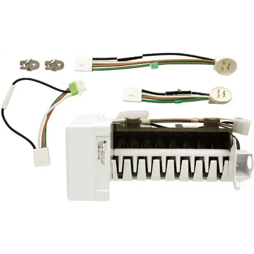This icemaker kit is a replacement part for refrigerators. It includes mounting hardware, multiple wire harnesses and an 8 cube ice maker. Compatible with select Whirlpool brand models.