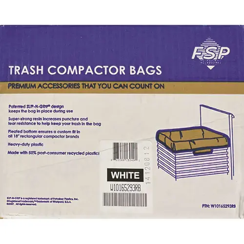 This 60-pack set of white plastic compactor bags fits 18" trash compactors. The unique Slip-N-Grip formula helps prevent the bags from slipping down into the compactor. These bags are an environmentally conscious product that is made from 50% post-consumer recycled plastic. Replaces item number 4318939.. Mfg #W10165293RB