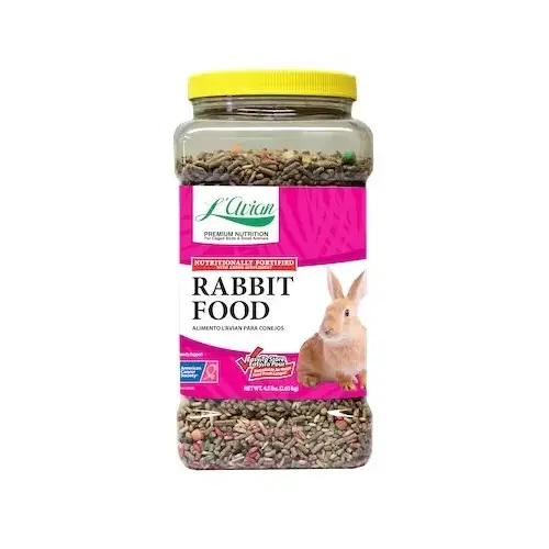 A premium rabbit food. Features: Ingredients Dehydrated Alfalfa Meal, Soybean Meal, Wheat Middlings, Soybean Hulls, Oat Groats, Kibbled Corn, Steam Rolled Oats, Dried Carrots, Dried Bananas, Dried Papaya, Raisins, Ground Corn, Salt, Cereal Distillers Dried Grains With Solubles, Calcium Carbonate, Monocalcium Phosphate, Soybean Oil, Flax Seed Meal, Potassium Chloride, dl-Methionine, Choline Chloride, Vitamin E Supplement, L-Lysine Monohydrochloride, Dried Cane Molasses, Yeast Culture, Magnesium Oxide, Ferrous Sulfate, Copper Amino Acid Chelate, Manganese Amino Acid Chelate, Zinc Amino Acid Chelate, Zinc Oxide, Yucca Schidegera Extract, Manganous Oxide, Calcium Pantothenate, Biotin, Niacin, Iron Amino Acid Chelate, Vitamin A Supplement, Sodium Selenite, Riboflavin Supplement, Pyridoxine Hydrochloride, Thiamine Mononitrate, Vitamin B-12 Supplement, Menadione Sodium Bisulfite Complex (Source of Vitamin K Activity), Vitamin E Supplement, Ascorbic Acid, Folic Acid, Papain, Dried Streptococcus Faecium Fermentation Product, Calcium Iodate, Citric Acid (A Preservative), Lecithin, Rosemary Extract, Added FD&C Colors (Red #3, Red #40, Yellow #5, Blue #1, Titanium Dioxide)
