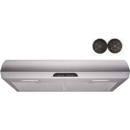 This beautiful under cabinet kitchen range hood is constructed of premium 430 stainless steel. The range hood features an unique design ventilation system containing dual blowers to provide powerful suction at 480 CFM air flow and effortlessly remove smoke, odors and grease. Winflo patented Quick-install hardware is included to make one person installation a breeze. Innovative push sensor control to adjust 3 level fan speed and 3 level light. The easy removable and dishwasher safe aluminum mesh filters keep your maintenance to a minimum. The unit is convertible and can be vented out of your dwelling either through back or recirculating (ductless) with charcoal filters (part # WRHF004S2, included) to help reduce odors.