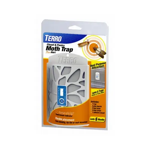 TERRO closet and pantry moth trap plus alert keep pests out of your clothes, fabrics and dry goods with the TERRO closet and pantry moth trap plus alert. The trap uses a powerful pheromone attractant to lure clothes moths and pantry moths into the glue trap, which stops them before they can continue breeding. This convenient trap works both as a trap to target active adult moth infestations, while also helping you to monitor new moth activity when an infestation first begins. Use the TERRO closet and pantry moth trap plus alert in areas where moths are common, including kitchen pantries and cupboards, as well as closets and drawers where clothes are stored. The trap includes two lures, which each last for up to three months up to six months of moth control in total. Each lure is stored in airtight pouches to prevent the attractant from depleting prior to use, so they remain fresh until opened. Meanwhile, the convenient Timestrip indicators make it easy to monitor lure life, so you know when it's time to replace. The TERRO closet and pantry moth trap plus alert features an attractive design and white finish to blend in with your decor so you can place it anywhere around your home. For your convenience, you can lay this trap flat, mount it or use it free-standing for ultimate flexibility.