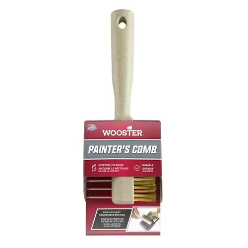 WOOSTER brushes are made to last, but heavy paint buildup shortens their lifespans. Thats why the Painters comb is the best tool for maintaining the quality and performance of WOOSTER paintbrushes. The WOOSTER painters comb is the most effective on brushes immediately after painting. Break down thick paint residue with its non-rusting brass bristles, which can also clean the handle and ferrule without scratching. The comb side has stainless steel pins for separating bristles to thoroughly clean out the brush heel and for reshaping the brush after cleaning to keep a sharp edge. For complete paintbrush care, add the Painters Comb as your go-to cleaning tool.