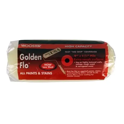 High-capacity Golden Flo rollers achieve fast no-skip coverage with fewer trips to the paint tray, good density fibers resist matting for a smoother finish, now a low-shed knit, Golden Flo is best for all flat or eggshell paints, stains and waterproofing.
