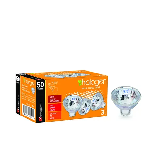 Xtricity Halogen Bulb, Wattage Rating: 50 W, 12 V, Lamp Base: GU5.3, Bi-Pin, Lamp Shape: MR16, Lamp Material: Glass, Lamp Finish: Clear, Lumens: 825 Lumens, Dimmable: Yes, Light Color: Soft White, Color Temperature: 2700 K, Average Life: 2000 hr, Beam Angle: 36 deg, Beam Spread: Flood