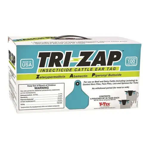 Tri-Zap is a sustained-release ear tag containing a synergized formulation of Zetacypermethrin, a potent, enriched pyrethroid compound and Abamectin, a highly active macrocyclic lactone that has never before been used in combination on cattle, plus the synergist piperonyl butoxide. Tri-Zap is for use on beef and dairy cattle, calves, and lactating dairy cows to control horn flies, face flies, lice, and spinose ear ticks. 1-2 tags per head controls face flies for up to 2 months.