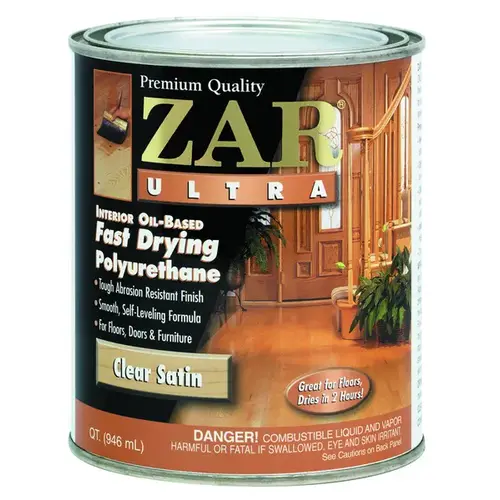 ZAR ULTRA polyurethane is an incredibly fast-drying, oil-based polyurethane that dries to a smooth finish on bare wood, in just 2 hrs, with no brush marks. Featuring a tough, abrasion-resistant finish and self-leveling properties, it works beautifully on hardwood floors, cabinets, furniture and woodwork.