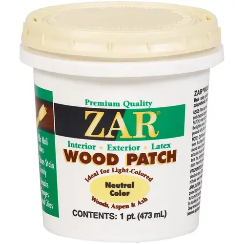 ZAR wood patch is a latex compound that both contractors and savvy do-it-yourselfers rely on to fill nail holes and repair cracks, gouges, broken corners and chipped edges on wood surfaces. It's excellent for a variety of uses because it only shrinks a little and can be nailed, sawed, sanded or drilled. ZAR wood patch can be used indoors or outdoors and accepts paint, varnish, shellac, polyurethanes and stains. In fact, it actually accepts stain more readily than conventional wood patching compounds.