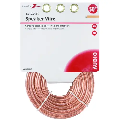 The Zenith 14 ga speaker wire, 50 ft provides connection from your speaker to your audio/video receiver or amplifier. This wire features two conductors made of copper that are insulated for undistorted signal. One side of the clear outer PVC jacket is marked with a white stripe to indicate polarity.
