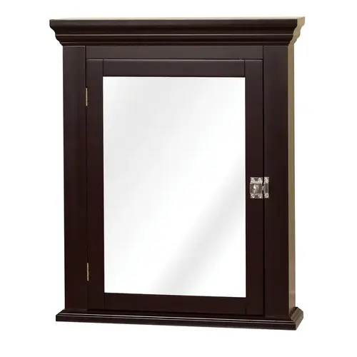 This traditional medicine cabinet has a mirror, rich crown pediment molding and decorative hardware. Two adjustable shelves allow for customized storage inside. Polished chrome hardware complements the cabinet's rich espresso finish.