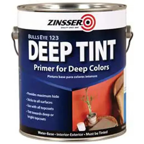 ZINSSER Bulls-Eye 1-2-3 Deep tint is a white pigmented, styrenated acrylic water- base deep tint capable primer sealer stain blocker and bond coat designed for priming all surfaces. Apply to interior and exterior walls, ceilings, doors, trim, fascia, soffits, foundations, railings and related paintable surfaces. Bulls-Eye 1-2-3 deep tint bonds to wood, plaster, concrete, gloss enamels, hardboard, glass and tile. It provides a rust inhibitive coating on iron railings, steel frames, piping. It resists the growth of mold and mildew in damp, humid environments. It resists high pH surfaces (up to 12.5) and seals most porous surfaces. Bulls-Eye 1-2-3 deep tint traps most stains in the primer film including graffiti, grease, rust, cedar and redwood tannin, creosote and asphalt stains.