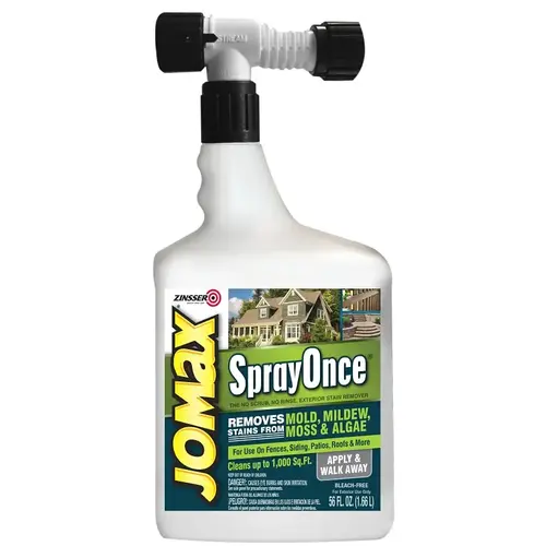 All it takes is one spray and stubborn exterior stains from mold, mildew and algae go away. There's no rinsing or scrubbing needed. Just apply and walk away and let Jomax Spray Once do the work. The bleach-free formula works with wind, rain and moisture over time to remove unwanted stains on fences, siding, roofs, concrete and more. Jomax Spray Once hose end is the simple way to remove tough stains . Automatically mixes the formula using a convenient hose end adapter. This no scrub, no rinse formula is safe to be used near plants and shrubs.