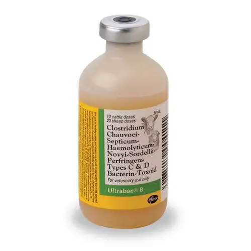 For use in healthy cattle and sheep as an aid in preventing blackleg caused by Clostridium chauvoei, malignant edema caused by Cl. septicum, bacillary hemoglobinuria caused by Cl. haemolyticum, black disease caused by Cl. novyi, gas gangrene caused by CI. sordellii, and enterotoxemia and enteritis caused by Cl. perfringens Types B, C and D. Although Cl. perfringens Type B is not a significant problem in North America, immunity is provided by the beta toxoid of Type C and the epsilon toxoid of Type D. Ultrabac 8 consists of killed, standardized cultures of Cl. chauvoei, Cl. septicum, Cl. haemolyticum, Cl. novyi, Cl. sordellii, and Cl. perfringens Types C and D, with an adjuvant.